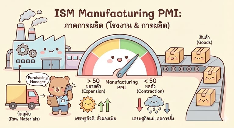 ISM vs S&P Global: คุณอาจจะเห็นข่าวคำว่า "Manufacturing PMI" จากค่าย S&P Global ด้วย แต่สำหรับสหรัฐฯ ให้เชื่อค่าย ISM (Institute for Supply Management) เป็นหลักครับ เพราะขลังกว่าและกราฟวิ่งแรงกว่า