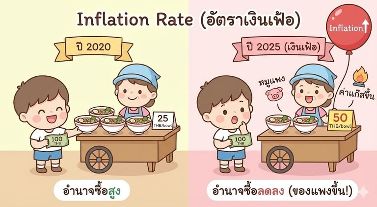 🏷️สรุป: แบงก์ 100 ของนาย A ยังเป็นกระดาษใบเดิม สีเดิม แต่ "ความสามารถในการเสกความอิ่ม" (Purchasing Power) หายไปครึ่งหนึ่ง นี่แหละครับคือฤทธิ์เดชของ Inflation
